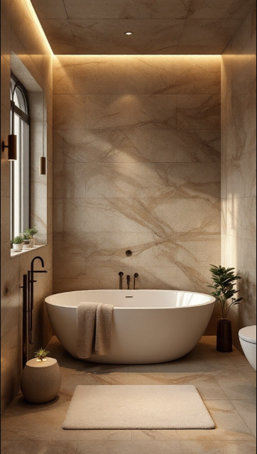 In this design, large stone tiles with subtle veining bring character and depth without overpowering the room. Their soft, earthy shades pair perfectly with clean-lined fixtures, striking a balance between natural charm and modern style.