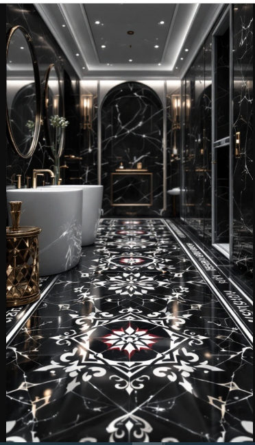 Sleek black marble walls provide a dramatic backdrop, beautifully contrasting with bright white fixtures. The natural veining and rich textures add depth, while the symmetry of the tile layout creates balance and harmony throughout the space.