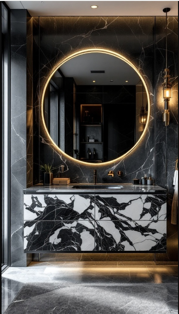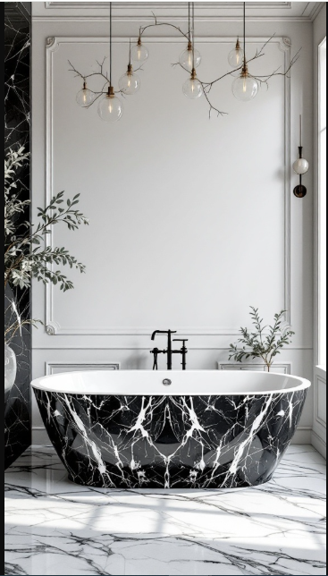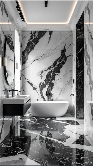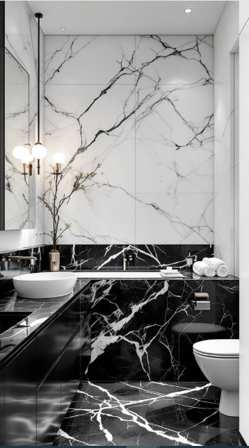 The black and white marble bathroom strikes a perfect balance between light and dark. Crisp white walls with delicate veining create a clean, airy backdrop, while deep black marble introduces a dramatic edge. The contrast is both eye-catching and refined, making the space feel expansive yet intimate.