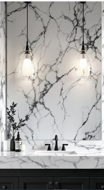 Chic lighting choices like these not only showcase the beauty of marble but also bring sophistication to the room. Striking the right balance between practicality and elegance is key.