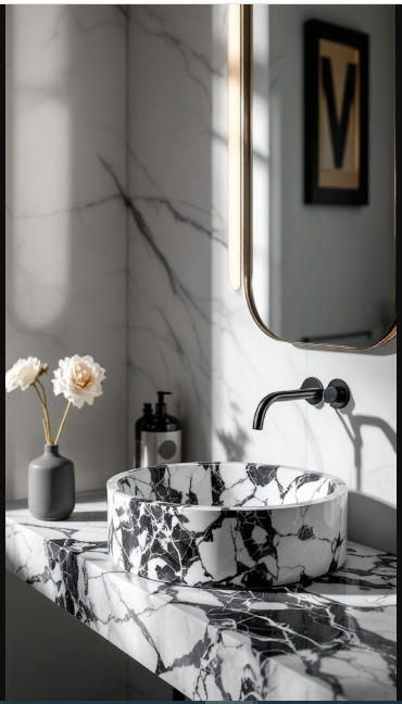 In bathroom design, a distinctive sink can instantly become the focal point of the space. In this black and white marble bathroom, the round marble basin stands out as both functional and artistic.