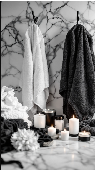 Soft white and deep charcoal towels stand out beautifully against the marbled wall, their contrasting shades adding depth while their textures invite comfort. Scattered candles further enrich the ambiance, casting a warm, calming glow that softens the room’s bold contrasts.