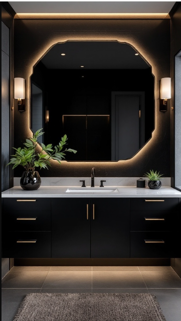 To soften the boldness, natural elements like lush greenery bring freshness and color, while a backlit mirror adds both practicality and a sense of spaciousness. Together, these details create a harmonious blend of sophistication and comfort.