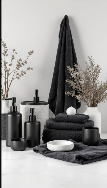 When it comes to black bathroom décor, the right accessories can transform the space with subtle sophistication. This collection of chic black accents brings cohesion and style, from sleek bottles to plush towels, each piece contributing to an elegant atmosphere.
