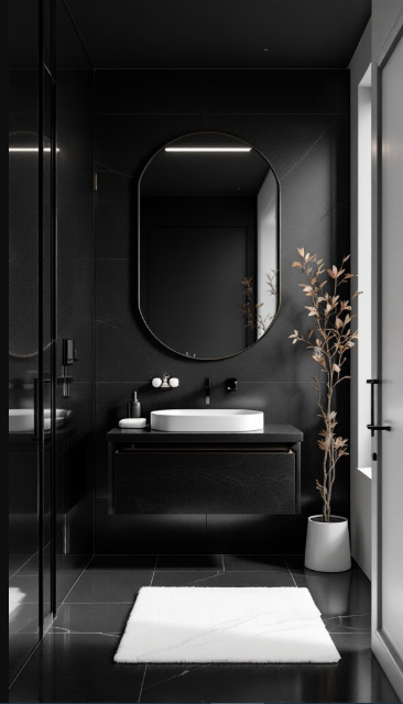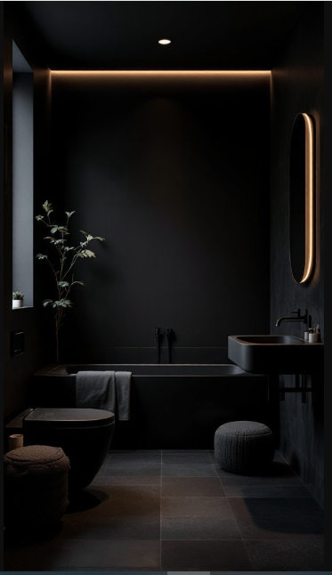In this design, matte black walls, tub, and sink flow together seamlessly for a bold, unified look. Soft, subtle lighting along the edges enhances the atmosphere, casting a warm glow that beautifully contrasts with the dark surfaces.