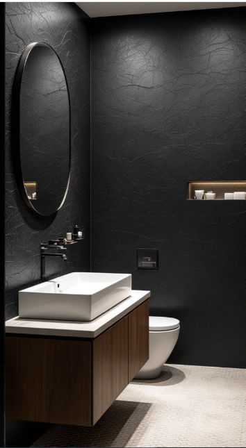 Black textured wall treatments can instantly bring a sense of sophistication and coziness to a bathroom. In this design, the dark, tactile walls add both depth and character, transforming the space into a bold statement piece.
