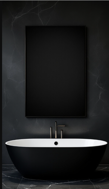 Black bathroom décor takes on a new level of sophistication when wall art is introduced. In this design, a sleek black wall provides the perfect backdrop, with a large minimalist frame serving as the focal point. This simple yet impactful detail elevates the space, adding depth and refinement.