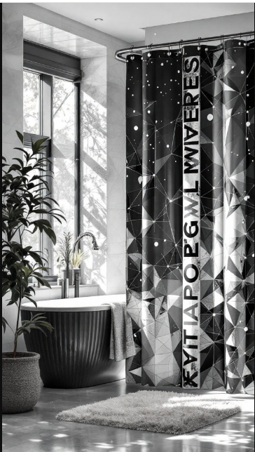 The look is further enhanced by thoughtful details—a modern bathtub and a soft, plush rug—that complement the curtain’s bold design. Together, these elements create a cohesive aesthetic that feels contemporary yet inviting.