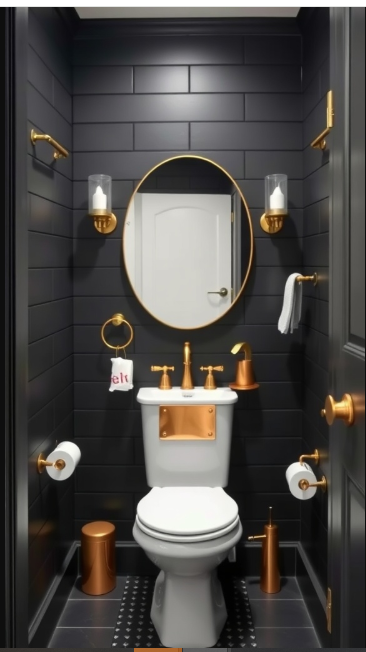 Every element is thoughtfully placed, creating a cohesive design. The textured black shiplap brings depth, while the golden accents infuse warmth and brightness, transforming even the smallest bathroom into a welcoming retreat.