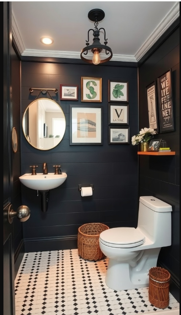 The black shiplap bathroom serves as a striking canvas, showing how wall décor can completely transform a space. The dark, textured walls create a dramatic backdrop that allows artwork to truly shine.
