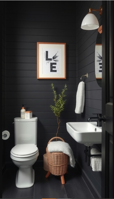 In a black shiplap bathroom, greenery introduces a lively contrast that softens the dramatic backdrop. The dark walls create a cozy atmosphere, while vibrant plants infuse the space with freshness and energy.