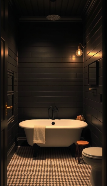 An exposed bulb hanging beside the bathtub adds a rustic touch, perfectly complementing the dark walls. Its vintage style balances the bold backdrop with warmth, drawing the eye and enhancing the overall aesthetic.