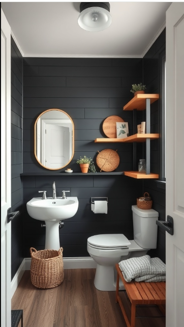 In this black shiplap bathroom, natural wood accents bring warmth and texture, creating a striking contrast against the dark walls. The pairing of bold black and light wood strikes the perfect balance between modern sophistication and inviting comfort.