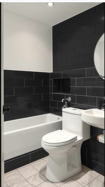 This high-contrast pairing not only highlights the fixtures but also brings balance to the space. A round mirror above the sink reflects light, opening up the room and softening the darker tones. The addition of white elements helps the bathroom feel brighter, larger, and more inviting.