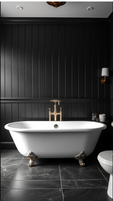 Featuring an elegant clawfoot design paired with polished gold fixtures, the bathtub exudes timeless sophistication while inviting moments of relaxation. The gleaming gold accents serve as a luxurious focal point, standing out beautifully against the moody backdrop.