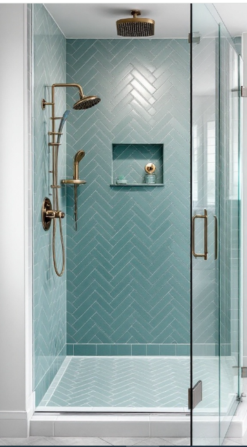 A teal herringbone shower surround is a stunning way to elevate your bathroom’s design. The herringbone layout brings timeless elegance with a modern twist, while the soft teal hue sets a calming, spa-like tone, turning your shower into a personal retreat.