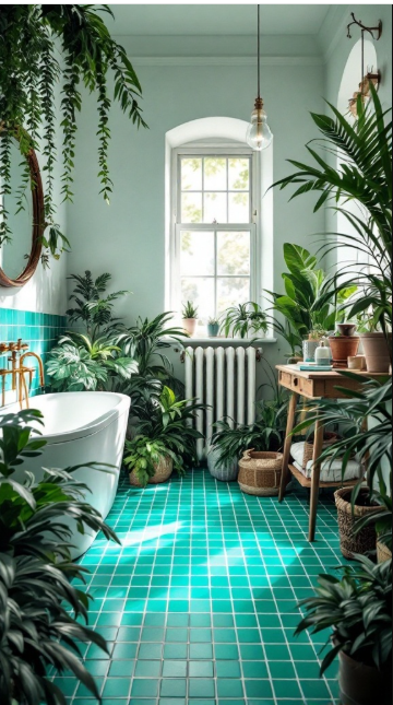 Turquoise floor tiles with crisp white grout can instantly infuse your bathroom with a cheerful, uplifting energy. The vibrant blue-green tones feel refreshing and serene, reminiscent of ocean waves and coastal escapes.