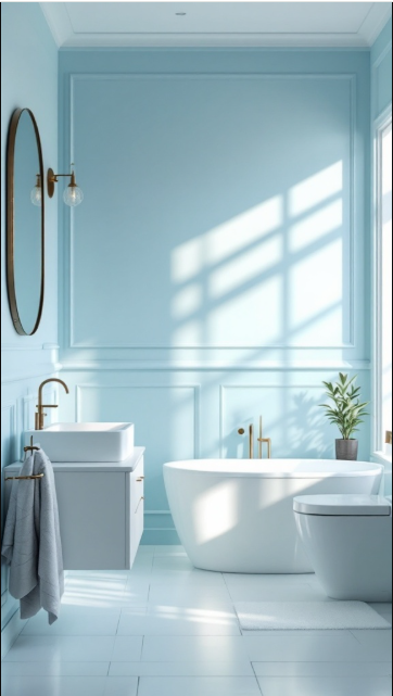 Soft powder blue wall panels can instantly refresh a bathroom, creating a light, calming atmosphere. This airy shade of blue makes the space feel open and inviting, especially when paired with crisp white fixtures and plenty of natural light.