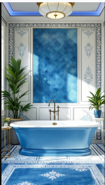 The surrounding tiles elevate the look further, with rich blue shades and intricate patterns that add depth and character. This palette evokes the calm of the ocean, bringing a sense of tranquility into the space.