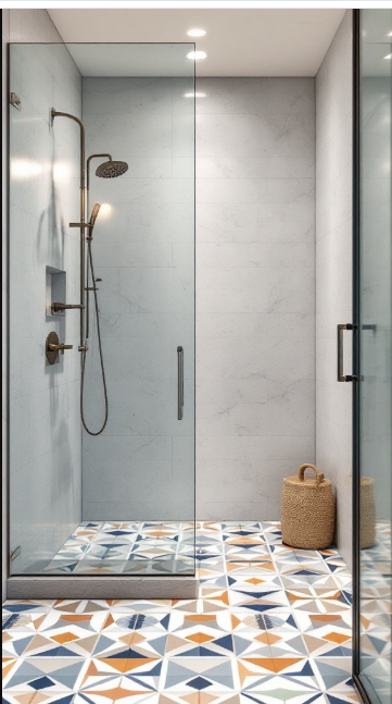 The bold floor design pairs beautifully with soft, neutral wall tiles, striking the perfect balance between modern flair and inviting comfort. The geometric shapes naturally draw attention, adding depth and interest without overwhelming the space.