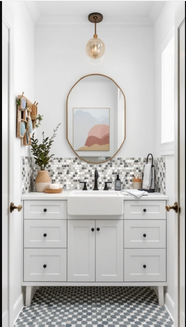 Finishing touches, like the round mirror and warm lighting, balance the bold tilework perfectly. Together, these elements create an inviting, sophisticated bathroom that feels both creative and welcoming.