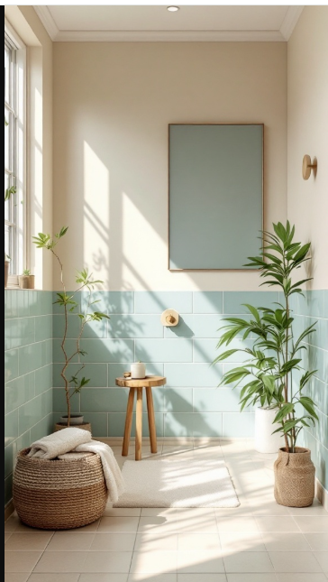 Thoughtful décor choices, like a simple wooden stool and a few planters, complement the pastel palette beautifully. The natural accents connect the indoors with the outdoors, while the greenery adds freshness and even boosts air quality.