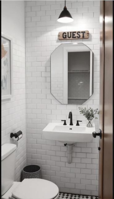 Dark fixtures, such as a black faucet and towel bar, provide striking contrast and give the bathroom a modern edge. A round mirror softens the sharp lines of the tiles, while a wooden “GUEST” sign adds a welcoming, personal touch. Small details like a potted plant bring in a hint of nature, enhancing the relaxed and inviting atmosphere.