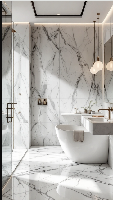 Expansive marble tiles across the floors and walls catch and reflect light, brightening the entire room. This not only enhances the sense of openness but also creates an airy, inviting atmosphere. Paired with sleek, minimalist fixtures and the gentle glow of warm lighting, the result is a perfect balance of luxury and comfort.