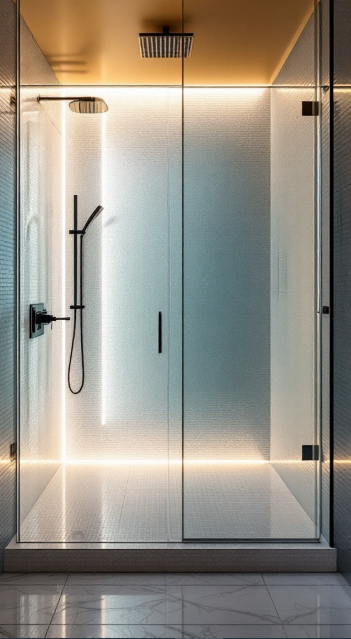 Beyond their beauty, glossy glass tiles are practical too. Their smooth surface naturally resists water and soap scum, making them simple to maintain and ensuring the shower always looks pristine with minimal effort.
