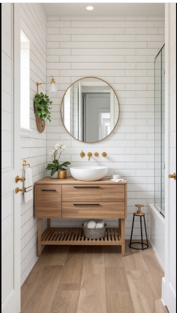 For a guest bathroom that feels warm and welcoming, natural wood-look porcelain tiles are a perfect choice. These tiles capture the rich character of real wood while delivering the durability and low-maintenance benefits of porcelain. In this design, the light wood flooring grounds the space beautifully, complementing the bathroom’s clean, modern aesthetic.