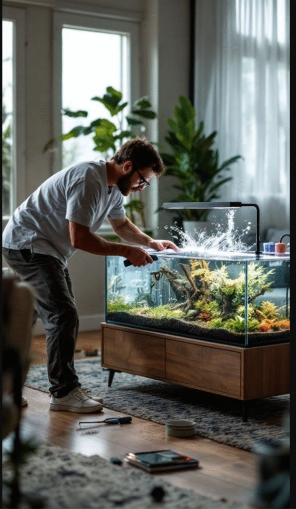 Maintaining water quality in a coffee table aquarium is vital for the health and well-being of your aquatic life. In the image, a person is carefully cleaning the aquarium—an essential part of keeping the environment safe and thriving. Consistent care ensures your fish stay happy and healthy.