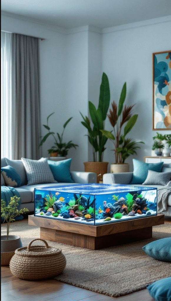 Incorporating aquatic-themed decor around your coffee table can transform your living area into a calm and welcoming retreat. A low-profile aquarium coffee table serves as a captivating centerpiece, bringing life and movement to the room. You can amplify this theme with thoughtfully chosen accents.
