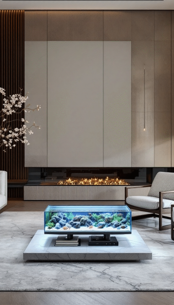 Incorporating an aquarium into your living space can turn it into a peaceful retreat. The image features a low-profile aquarium coffee table that doubles as both a practical piece of furniture and a stunning focal point.