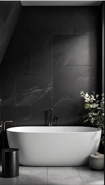The elegant freestanding tub takes center stage, inviting relaxation. Surrounding plants soften the intensity of the black surfaces, bringing a touch of nature indoors. Subtle wall textures add depth, enhancing the room’s sophisticated vibe.
