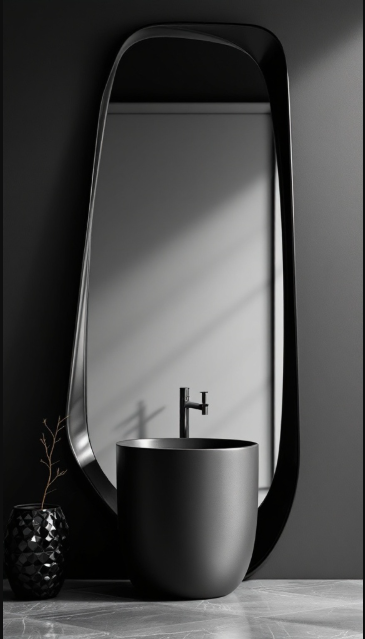Soft curves in the mirror beautifully contrast the sharp lines of the black walls, while its reflective surface enhances light, making the bathroom feel more open and inviting. The sleek finish ties in seamlessly with other elements, from the minimalist sink to decorative accents like vases.