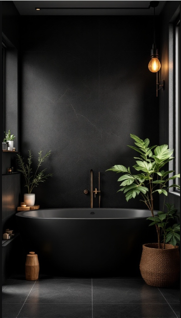 This luxurious black bathroom perfectly demonstrates how natural elements can complement dark, dramatic tones. The deep black walls and sleek fixtures create a bold backdrop, while greenery provides a refreshing, organic contrast.