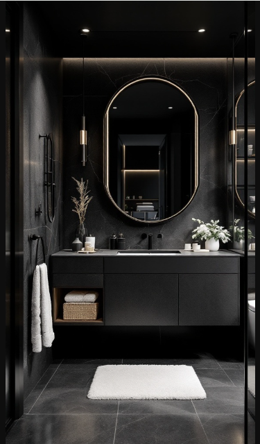 Elevate your space with a luxurious black bathroom that blends sophistication and style. Rich, dark tones set a chic, calming atmosphere—ideal for relaxation after a long day. Thoughtful details, from sleek fixtures to soft, plush towels, transform daily routines into moments of indulgence.