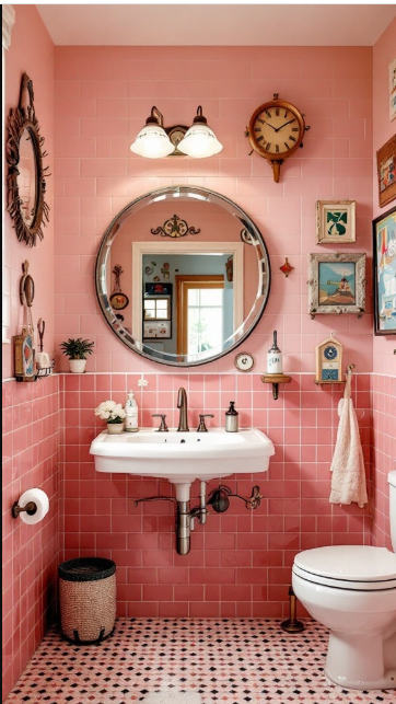 Step into a bathroom lined with vintage pink tiles, and you’re instantly wrapped in a sense of nostalgia. The soft blush tones create a cozy, welcoming atmosphere that feels both timeless and charming. It’s a perfect example of how retro design can be reimagined with personality and flair.