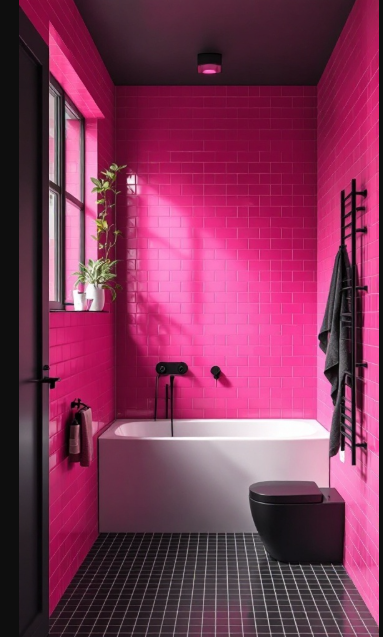 The vibrant pink tiles bring energy and playfulness to the space, while deep black fixtures—like the taps and toilet—anchor the palette with sophistication. A sleek black towel rack and dark ceiling frame the walls, adding depth and balance that highlight the charm of the pink tiles.