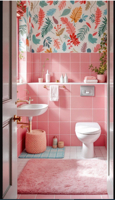 This bathroom exudes charm with its pink tiles, which create a warm, inviting backdrop. The varying shades of pink add depth, while the floral wallpaper introduces bursts of color and nature-inspired patterns that brighten the space.