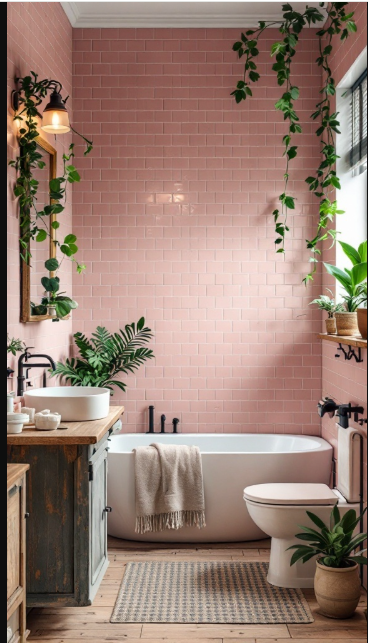 To elevate the design even further, incorporate handmade or thrifted pieces for character and authenticity. A woven rug underfoot adds both texture and comfort, tying the room together. The mix of rustic decor and pink tile creates a charming retreat that feels warm, stylish, and effortlessly relaxing.