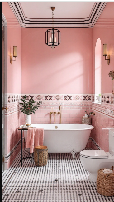 This bathroom is a stunning showcase of Art Deco elegance, elevated by a cheerful pink palette that adds warmth and charm. The soft pink walls create a bright, inviting backdrop, setting the tone for a space that feels both stylish and welcoming.