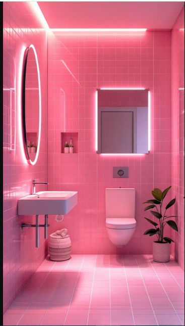 LED strip lights placed along the walls or above mirrors provide effective, modern illumination that showcases the pink tiles while lending a contemporary edge. Backlit mirrors, in particular, cast an inviting glow that reflects light and makes the space feel larger and more open.