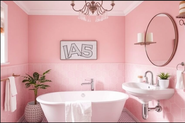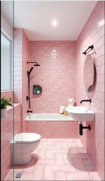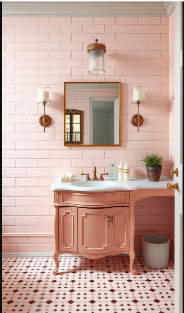 Finishing touches, such as patterned floor tiles, add personality and tie the space together. The interplay of pink with deeper tones introduces a refined yet whimsical vibe. This design shows how pink can be both stylish and classic, making it a perfect choice for those who want a bathroom full of charm and character.