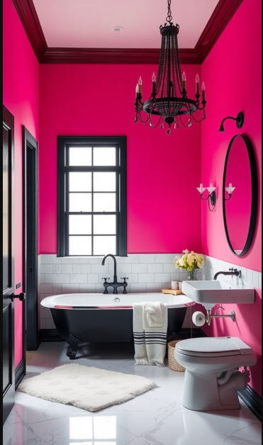 Black accents, from the elegant chandelier to the sleek fixtures, add contrast and sophistication. Together, the pairing of bold pink and timeless black creates a dynamic yet balanced aesthetic.