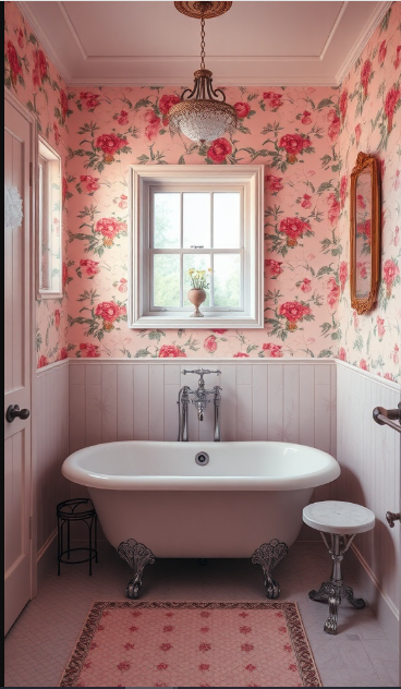 Pink floral wallpaper brings a romantic touch to the bathroom, with its soft hues and delicate patterns setting a soothing atmosphere. It transforms the space into a cozy retreat where every detail encourages relaxation.