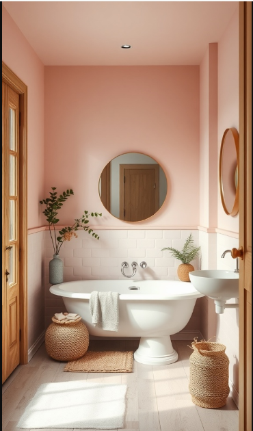The crisp white bathtub becomes the centerpiece against the soft pink backdrop, drawing the eye and anchoring the room. Layering in natural textures—like a woven rug or baskets—introduces an organic touch that enhances the harmony of the space.
