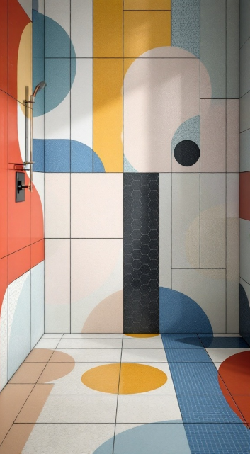 Geometric shower floor tiles are a perfect way to make a bold design statement. In this example, a mix of shapes and colors creates a vibrant, inviting atmosphere. Circles, lines, and color blocks draw the eye and bring energy into the space.