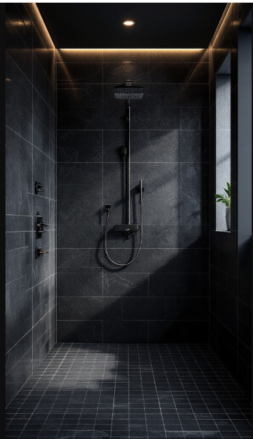 In the example shown, smooth black tiles flow seamlessly from the floor to the walls, giving the space a modern, cohesive look. Clean lines, stylish fixtures, and soft lighting enhance the minimalist design while adding warmth and depth.