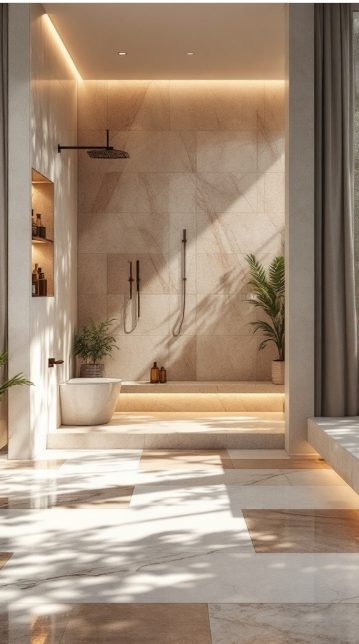Natural stone tiles bring an unmatched sense of elegance and warmth to bathroom design. In this serene shower space, the soft beige and cream tones on both the floor and walls create a calming, spa-like atmosphere that’s perfect for relaxation.
